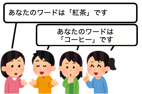 ワードが決定したら参加者の一部に人狼用のワードが配られ、残り全員に村人用のワードが配られます。