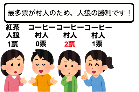最多票が村人だった場合は人狼の勝利です。
