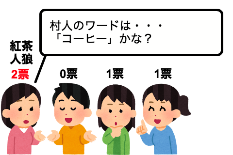 村人のワードがなんだったのかを当てられれば人狼の勝利、当てられなければ村人の勝利となります。